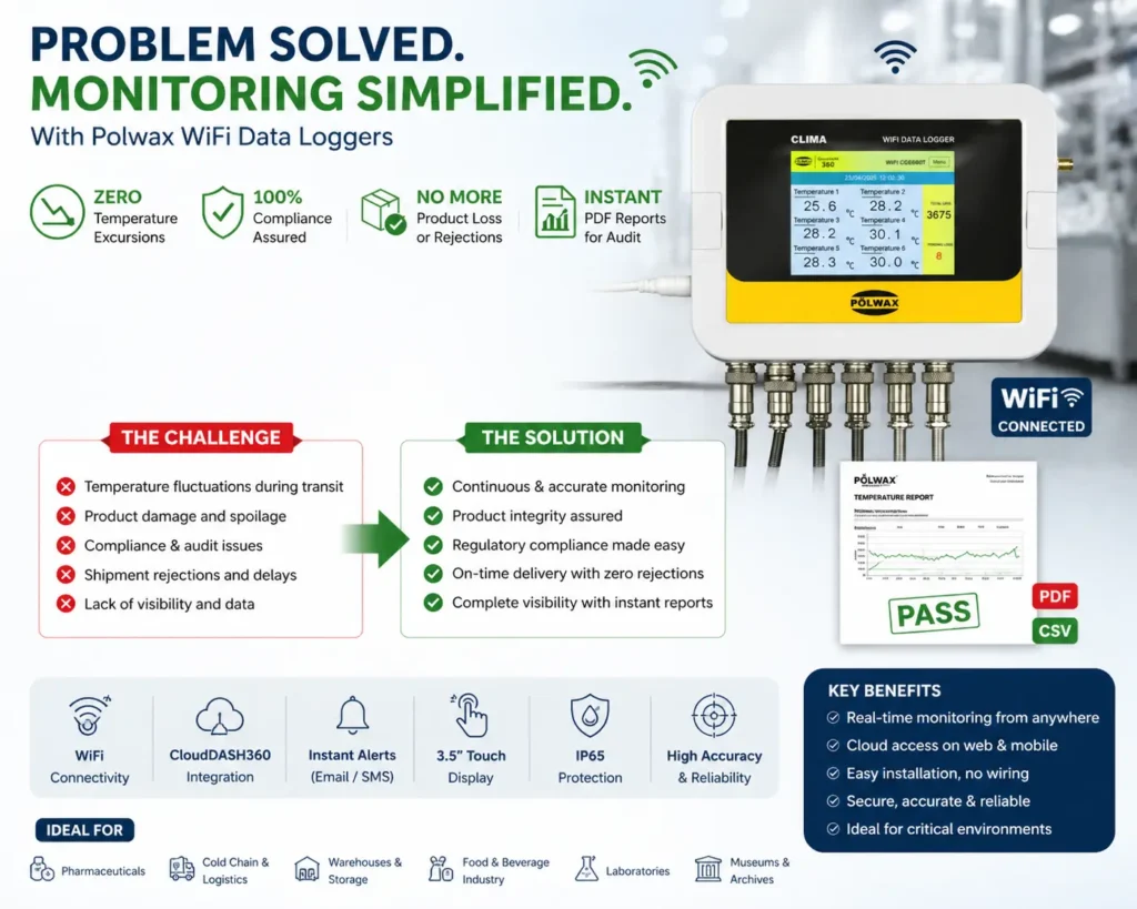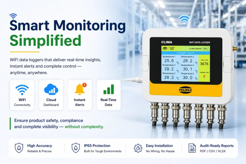 Polwax CLIMA dataloggers offer high accuracy, continuous recording, and remote accessibility—making them ideal for critical industrial applications