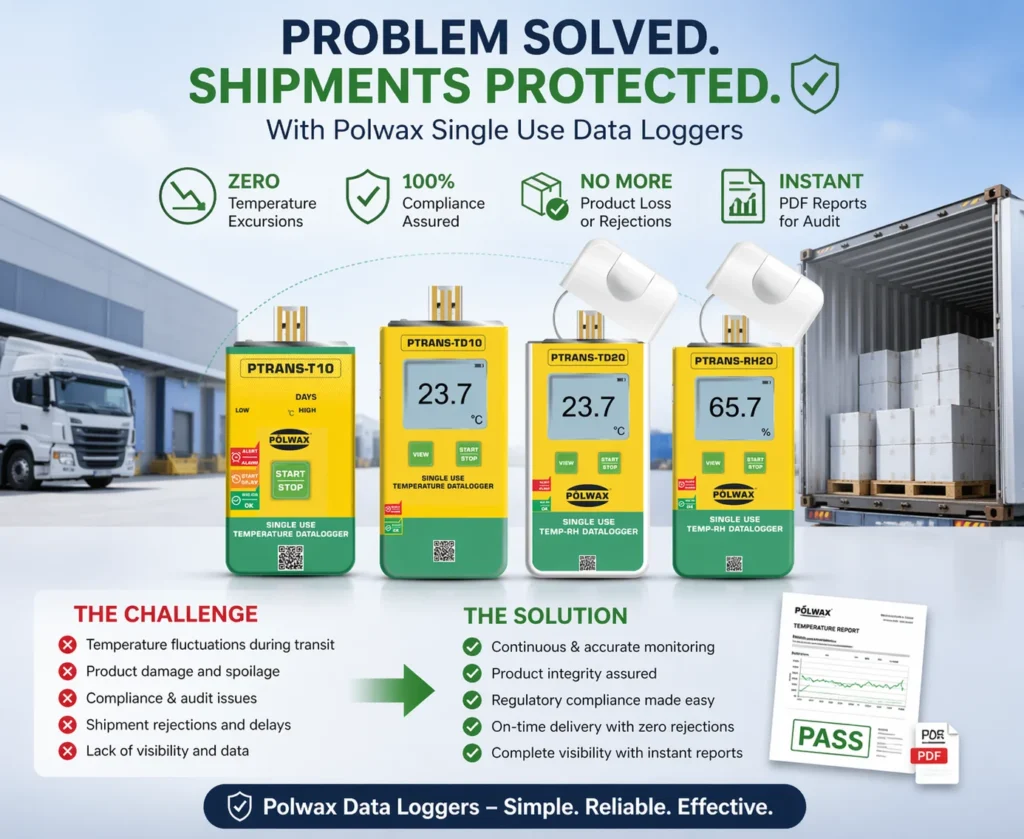 Ensure your products remain within safe temperature limits throughout the journey. Polwax data loggers provide continuous monitoring and instant reports to support quality and compliance.